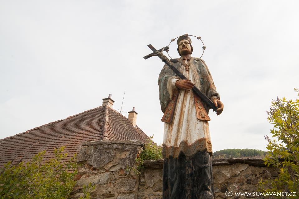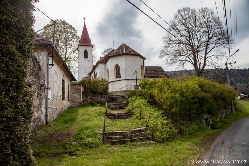 Štíhlá hranolovitá věž byla přistavěna později, stejně jako sakristie a předsíňka. V západním průčelí je hlavní vchod a nad ním okno. Po jeho stranách jsou dva náhrobníky, text na nich je hůře čitelný. Na jižní straně je vchod do věže a druhý do kostela.