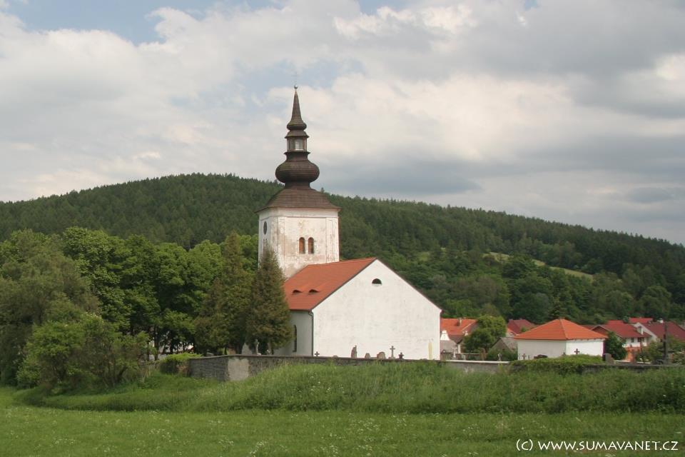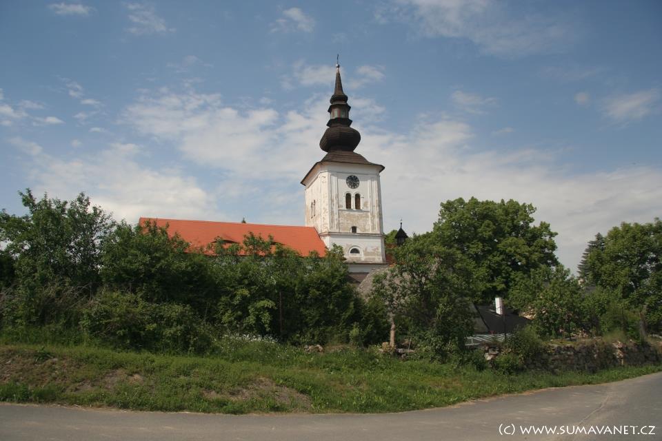 Presbytář je raně gotický, v 18. století při barokní přestavbě byl prodloužen a rozšířen. Roku 1854 byla vystavěna mohutná hranolová věž. Hlavní oltář je podle vzoru hlavního oltáře chrámu v Klatovech, vedlejší oltář sv. Barbory z rokokového období.